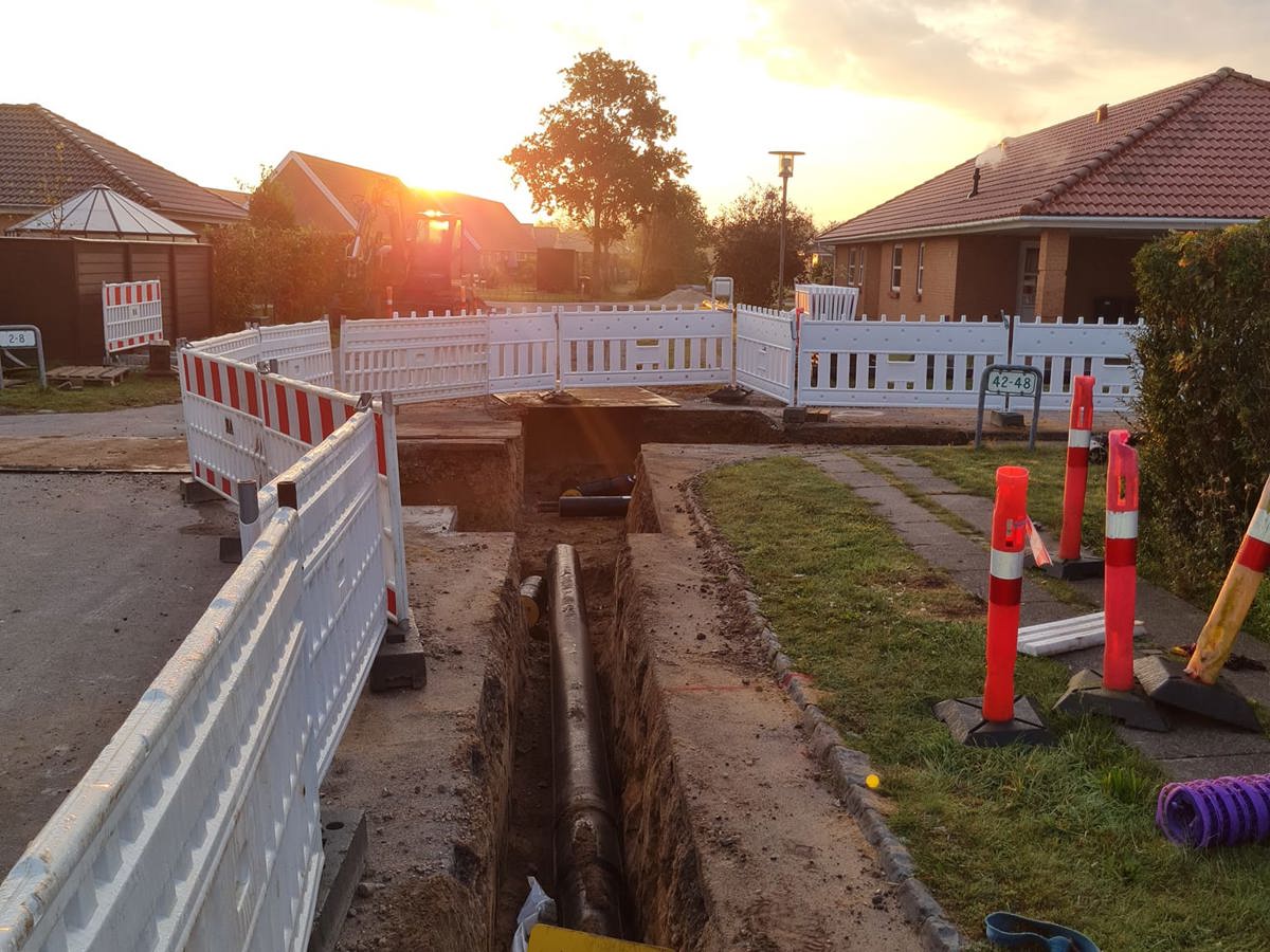 På stykket ved Vittenbergskolen er vi blevet bremset i gravearbejdet – blandt andet på grund af arkæologi og det dårlige vejr. Derudover venter vi på en gravegodkendelse fra myndighederne, som har taget længere tid at behandle, end vi havde regnet med.