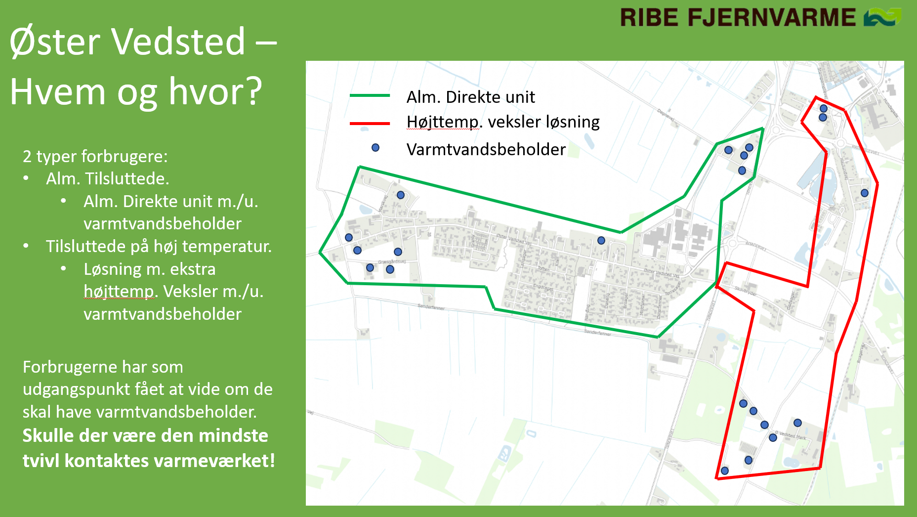 Fra mandag d.13. maj kan de første forbrugere i Øster Vedsted skifte deres eksisterende varmeløsning ud med fjernvarme. Det gælder alle forbrugere, som bor indenfor det grønne område på kortet nedenfor.